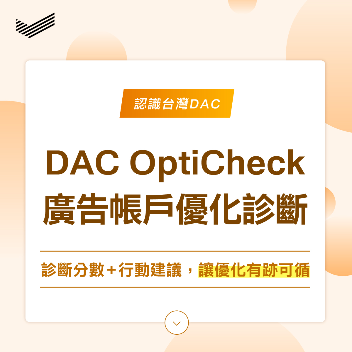 數位廣告快找不到優化方向了?面對複雜數據您需要一套專業、系統化的解決方案!DAC OptiCheck 結合DAC獨家洞察與媒體官方最佳實踐,為您的廣告帳號提供全面、客製化、具策略深度的健康管理服務,助您精準突破成效瓶頸!
